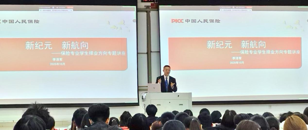 10月20日下午,我院举办“金融机构进校园”系列活动,特邀中国人民健康保险股份有限公司河南分公司党委委员、纪委书记李泽军作题为“新纪元 新航向”的专题讲座,旨在助力金融学院学子做好职业规划。活动采用“线上+线下”形式,我院2025级全体在校生分别在郑东校区和文北校区同时参加,讲座由院长赵紫剑主持。